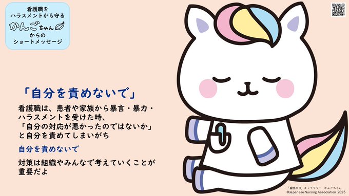 ❖本会公式Xにて、看護職のみなさまへ、ハラスメントを受けた時の対応や心を守るための予防策について、かんごちゃんからのメッセージ発信中です。ぜひ、ご覧ください。(毎週水曜日更新、全10回)