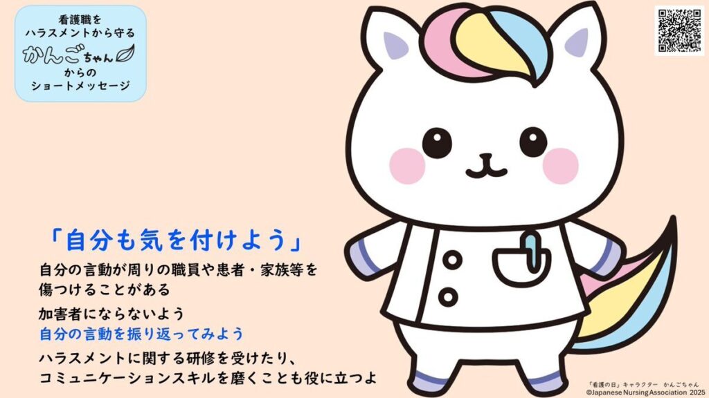 ❖本会公式Xにて、看護職のみなさまへ、ハラスメントを受けた時の対応や心を守るための予防策について、かんごちゃんからのメッセージ発信中です。ぜひ、ご覧ください。(毎週水曜日更新、全10回)